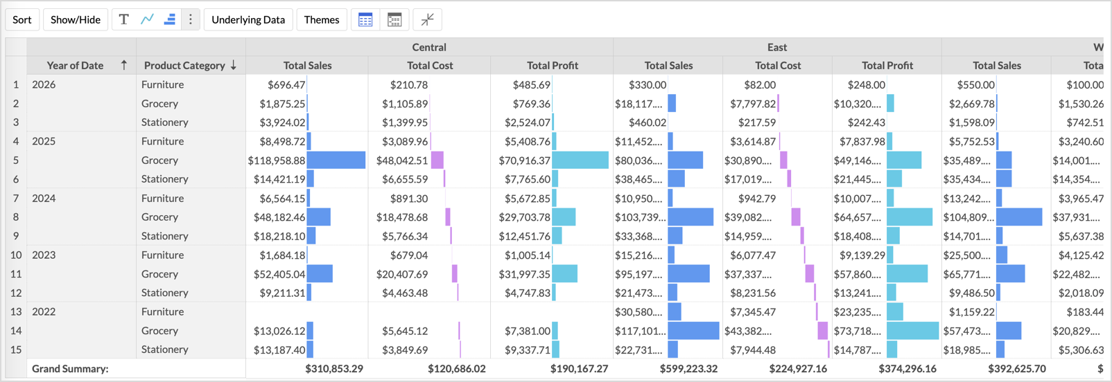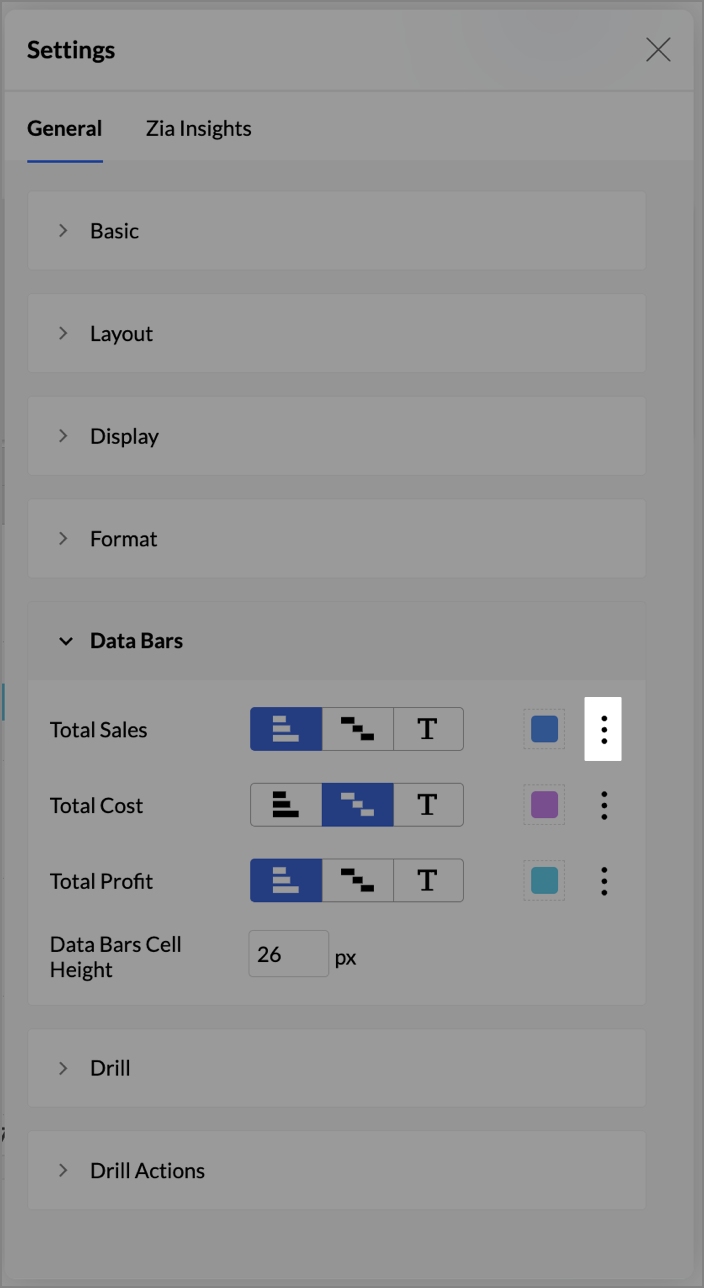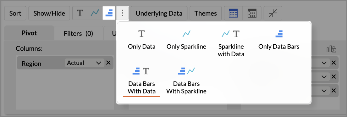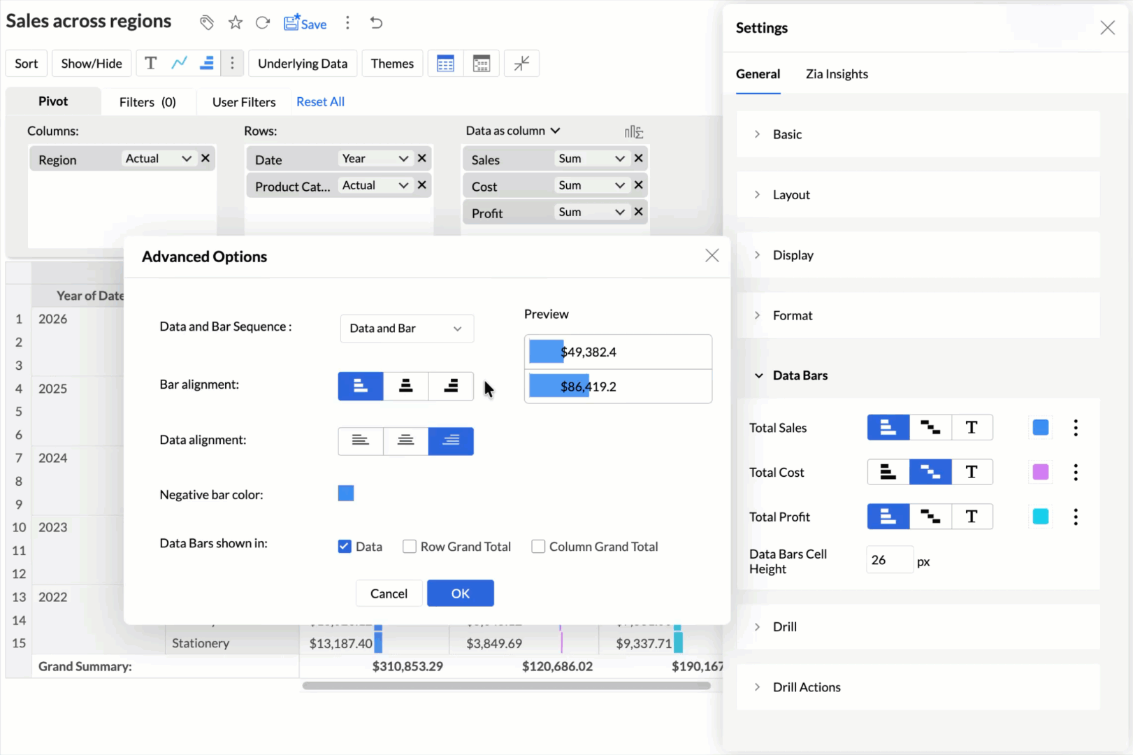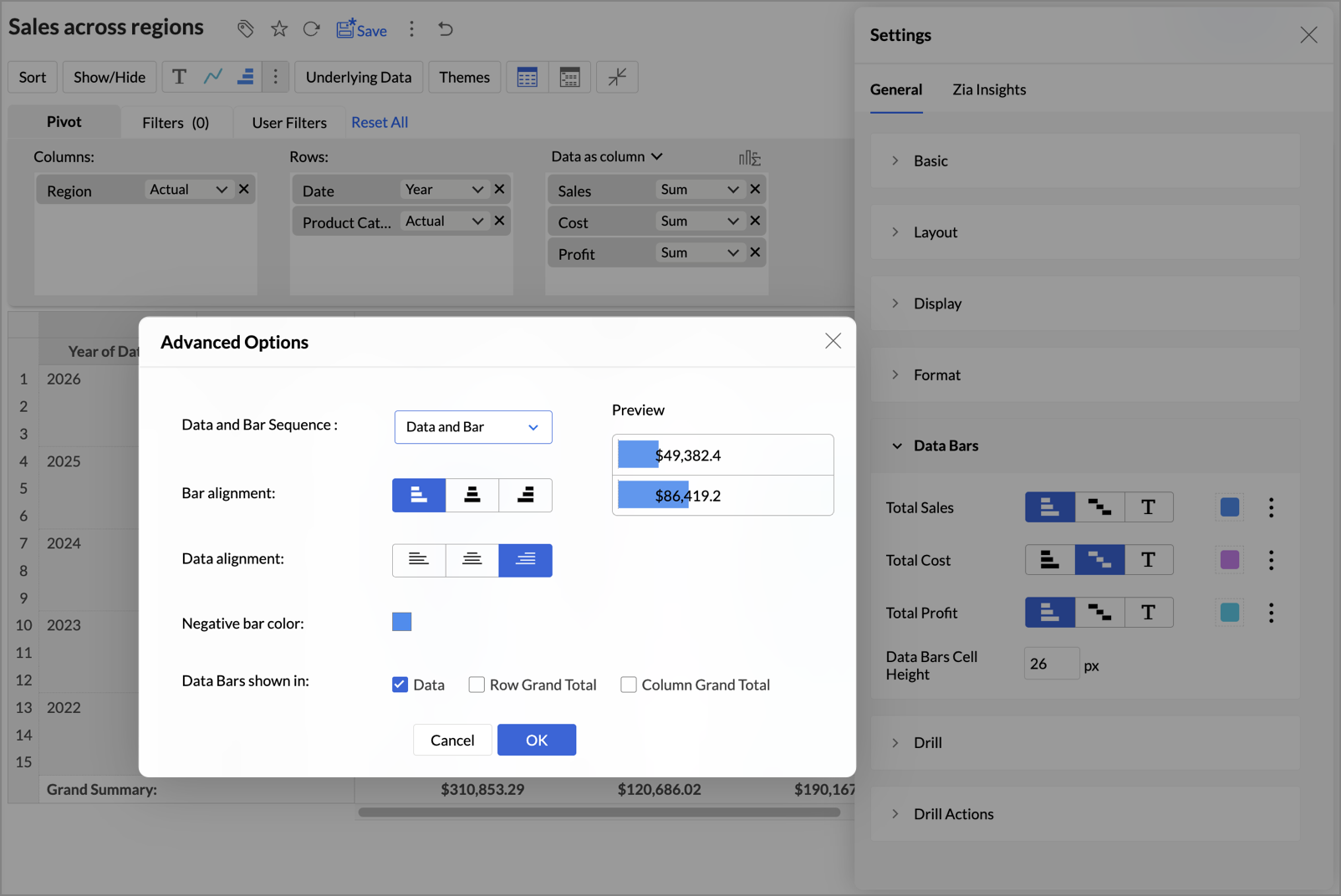 • Data Bars shown in: Select checkboxes to show Data Bars in Data, Row Grand Total, and Column Grand Total.