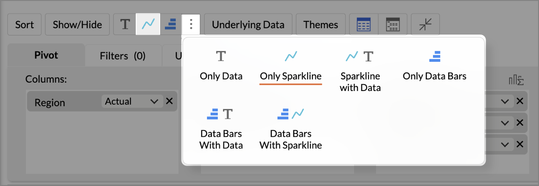 • Data Bars with Sparkline - Displays data bars and sparklines together for the selected columns.