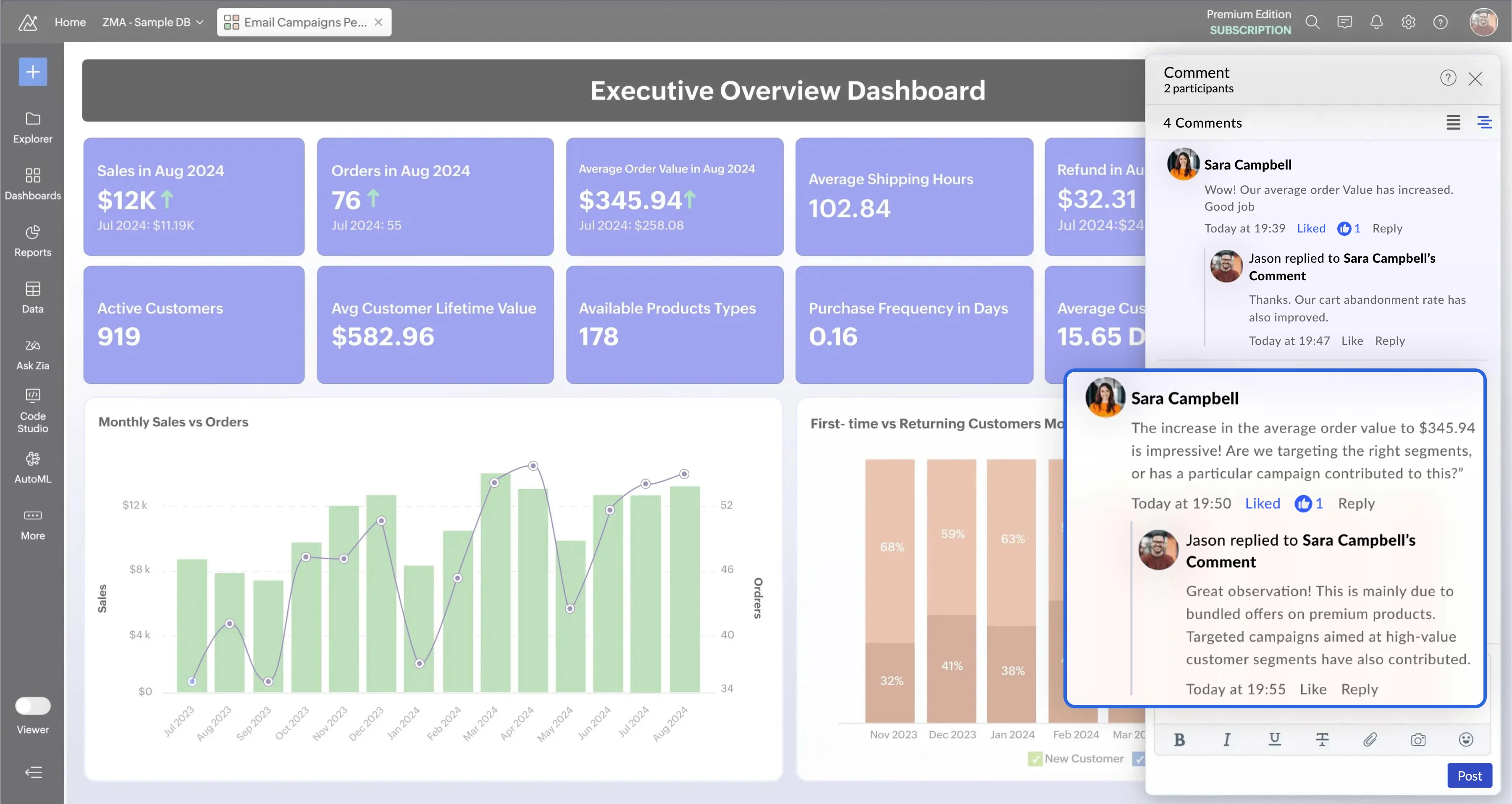 Collaborate seamlessly without sharing screenshots or creating new threads. Zoho Analytics enables teams to comment on reports, tag peers, attach references, and preserve context - all within the same platform.