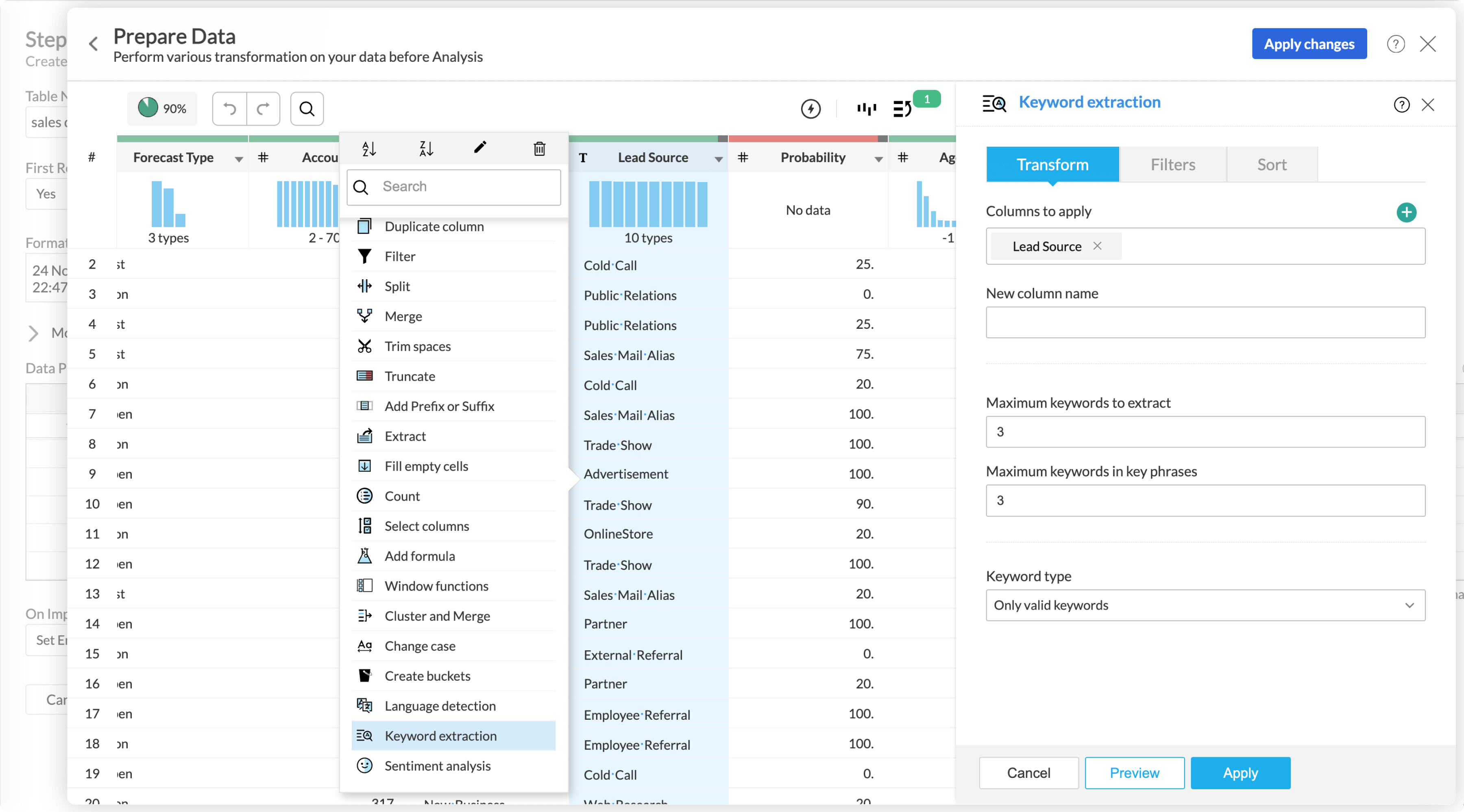 Zoho Analytics comes with its own self-service DataPrep engine, eliminating the need for third-party ETL tools. Clean, enrich, transform, and model your data with AI-assisted suggestions - all inside the same platform.