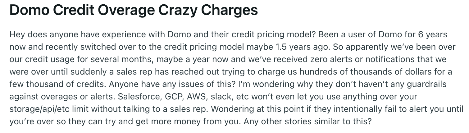 Support experiences are mixed too; some customers describe slow or inconsistent responses when they need help, and also the confusion around Domo's consumption based pricing, makes it harder to estimate long-term costs.