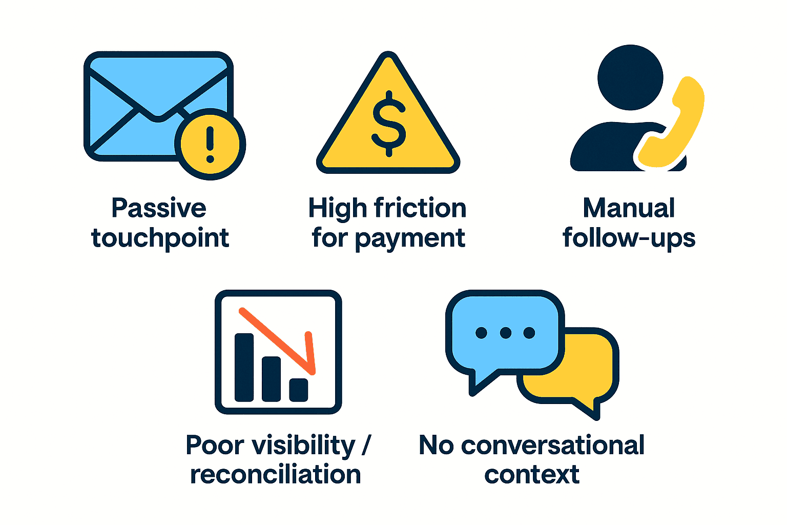 5. No conversational context. Questions about the invoice (clarifications, discounts, disputes) often lead to back-and-forth exchanges that delay collections.