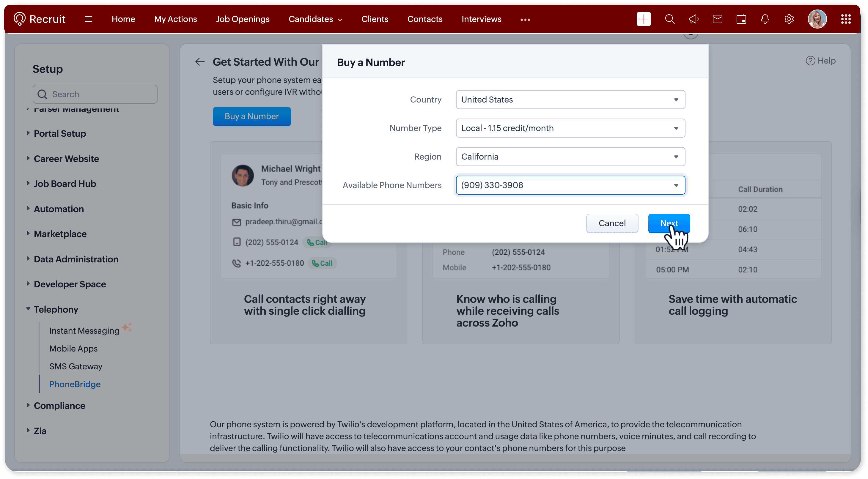 With built-in telephony, you can make and receive calls directly within Zoho Recruit. Every interaction is automatically logged for the respective candidate or client record.