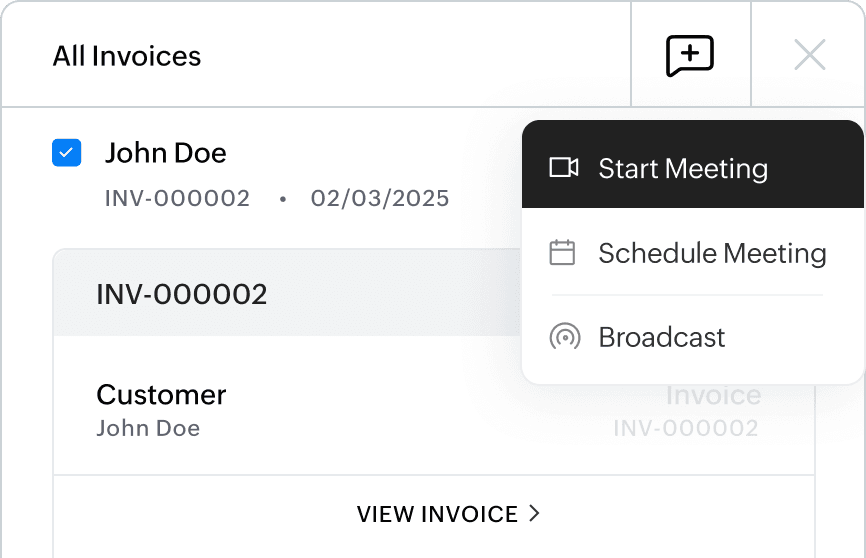 Chat via text, voice, or video (one-on-one or as a group) directly from relevant transactions, items, or contacts—features powered by Zoho Cliq (no separate purchase required). Promote efficient communication to ensure all discussions are relevant, focused, and easy to track over time!