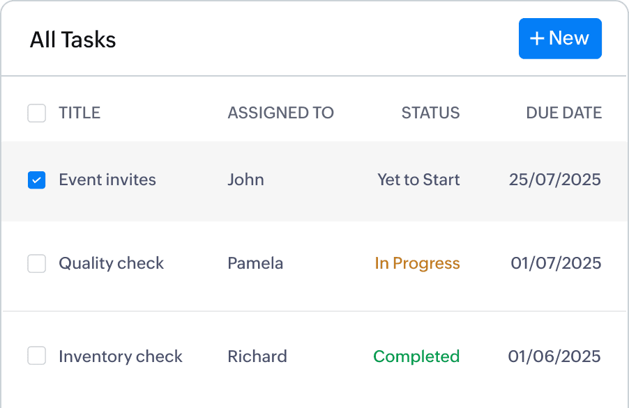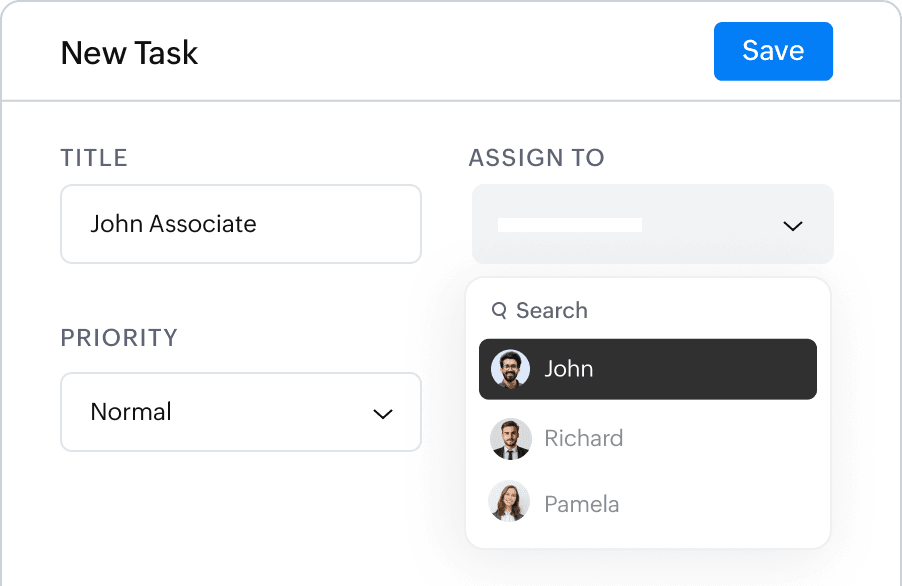Easily create tasks from any module, whether it's documents, contacts, or items. Assign them to the right people, set priorities, and other details to ensure they get done efficiently.