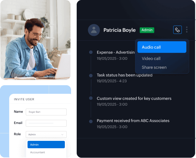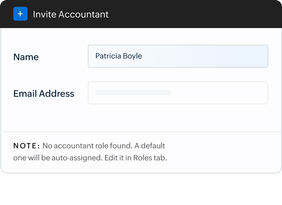 Invite your accountant to join your Zoho Books account to manage books for your business from anywhere. Your accountant/bookkeeper will be able to perform key financial management activities with this role.