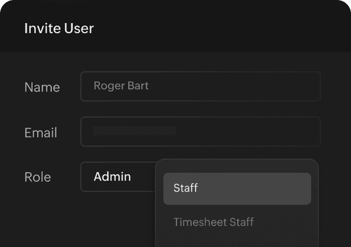 Pick from existing user roles with varying degrees of access to modules and permission to view, edit, and delete records. Onboard users with Staff, admin, and timesheet privileges in a click.