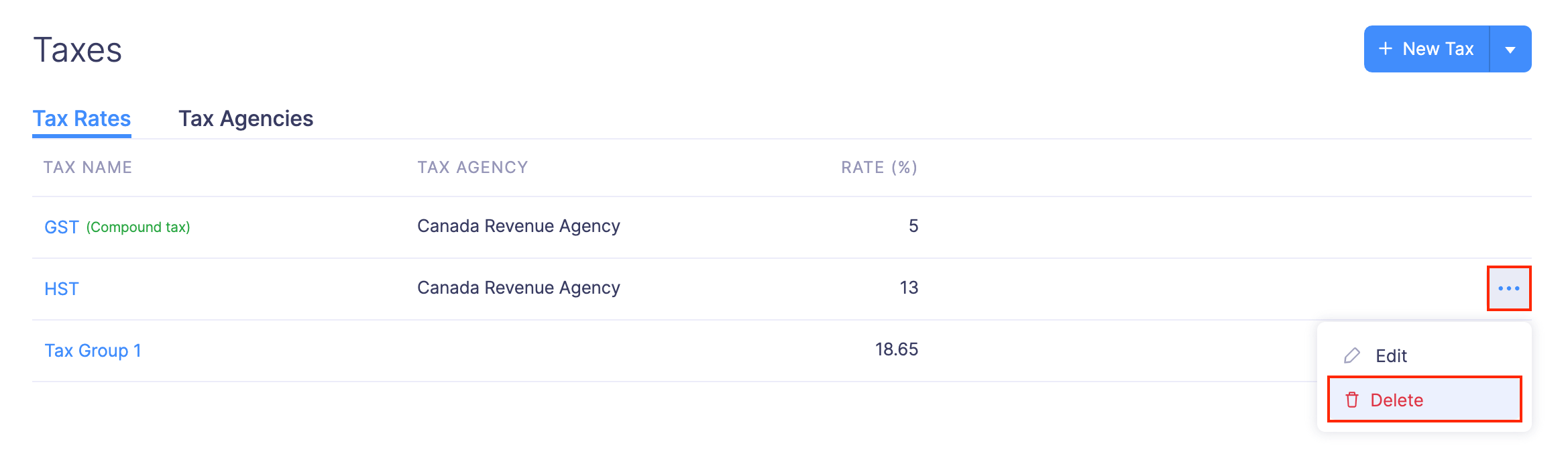 - Click the More icon at the right corner of the tax rate you want to delete.