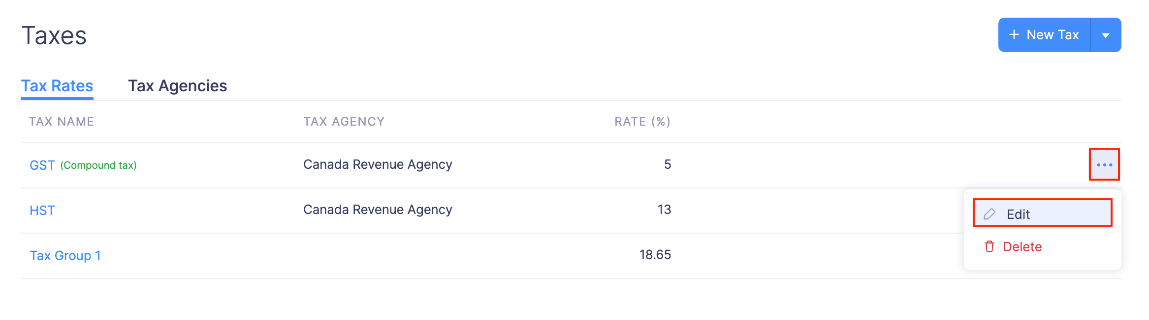 - Click the More icon at the right corner of the tax rate you want to edit.