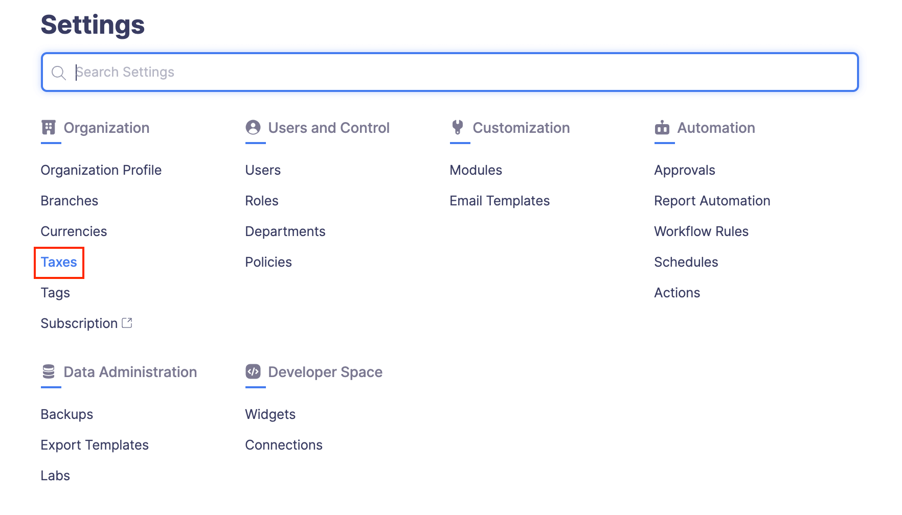 Once you enable taxes, you can create your taxes in Zoho Expense based on your country’s tax policies.
