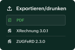 • Rechnungsexport in XML-Formate gemäß XRechnung und ZUGFeRD.