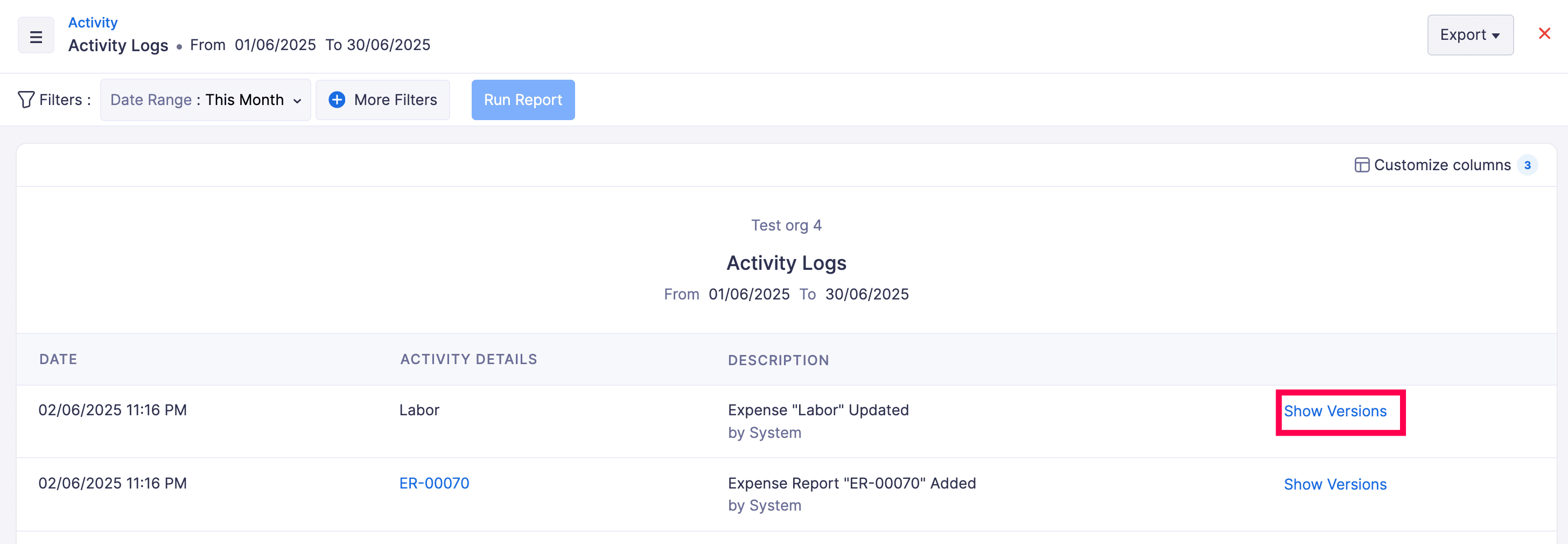 View all the activities performed in Zoho Expense, such as creating transactions, editing transactions, submitting transactions for approval, etc., for a given period. Details regarding the date and time of performing the action will be displayed. You can also view and compare the various versions of the transactions from the time they were created. To do this:
