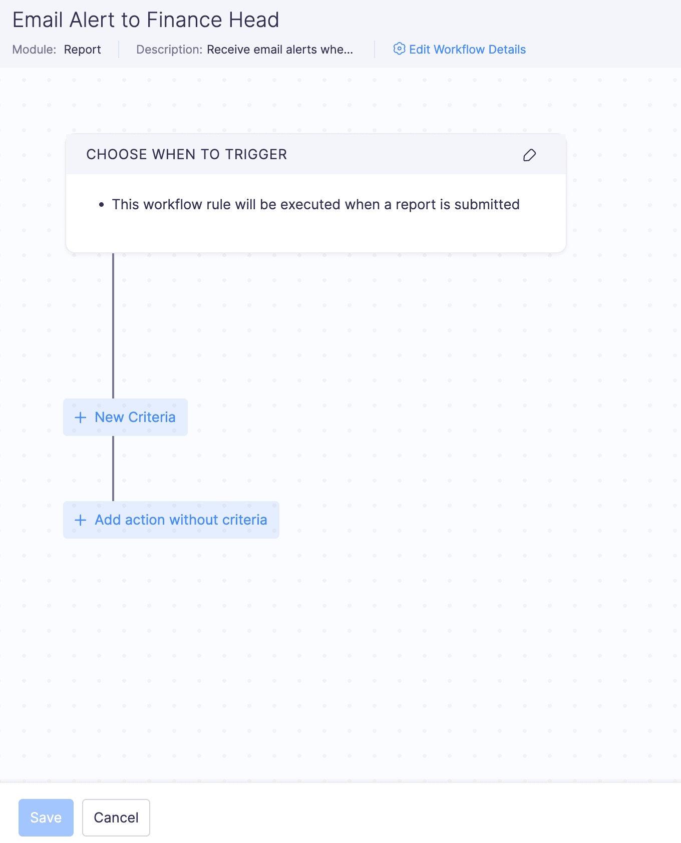 For example, you can set up a workflow rule in such a way that an email notification should be sent to the Finance Head automatically, whenever an expense report exceeds the threshold limit.