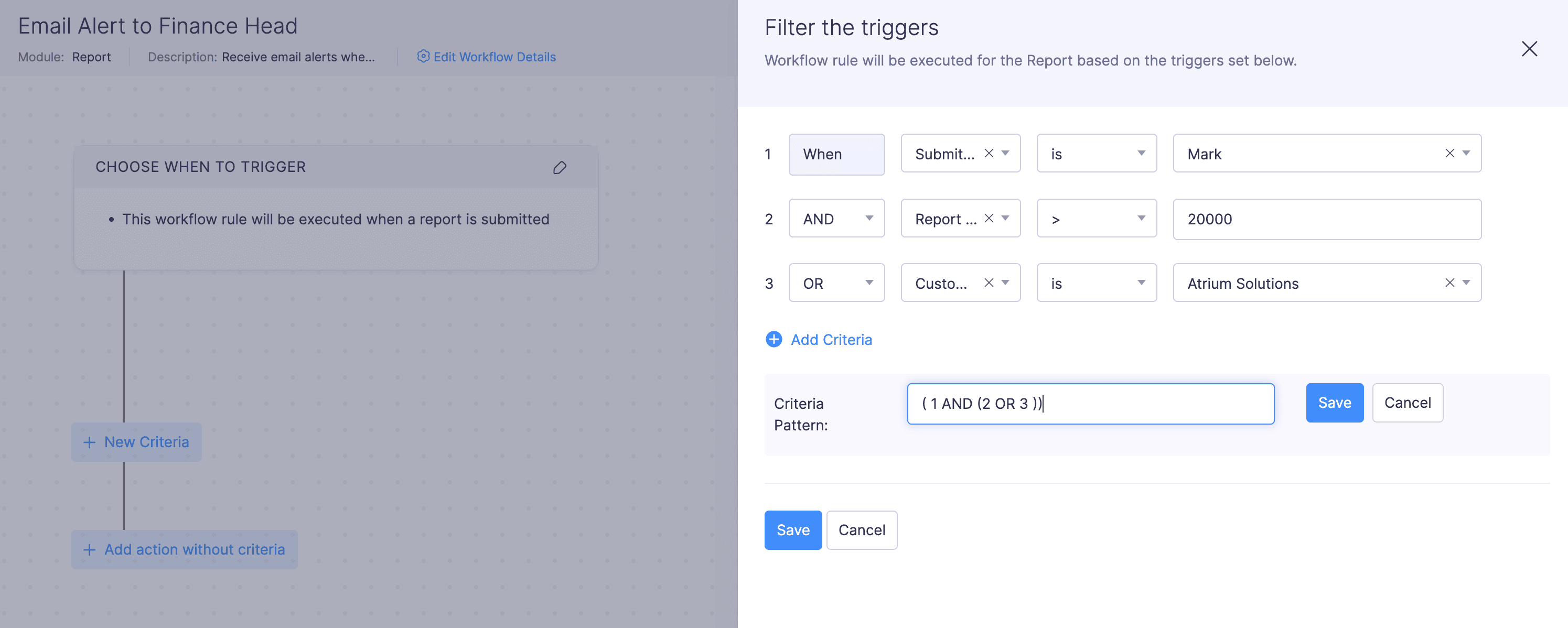 According to the criteria, the workflow will be triggered if the first two conditions are satisfied (or) when the third condition alone is satisfied, i.e, the workflow will be triggered if the Owner of the report is Mark and the report total is greater than $2000. Or, it will be triggered when the customer is ‘Atrium Solutions’, irrespective of the owner of the report or the report total. Since that is not what you were looking for, you can edit the criteria pattern. Click Change Criteria and manually entering the criteria in the CRITERIA PATTERN field as shown below.