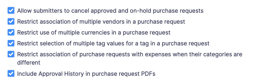 - You can include the approval history in purchase request PDFs by checking the Include Approval History in purchase request PDFs box.