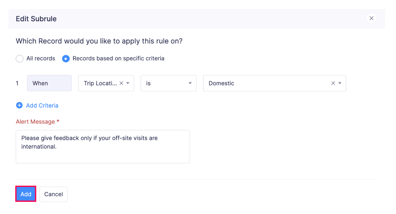 If you would like to include an additional rule to your existing condition, you can add subrules. This is applicable only when you’ve chosen to apply the rule to transactions based on specific criteria. Here’s how to add subrules to the validation rules: