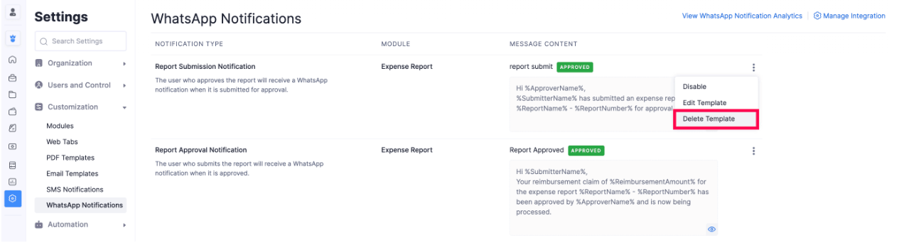 Warning: Ensure that you delete the templates from Zoho Expense and not from Meta to avoid syncing issues.