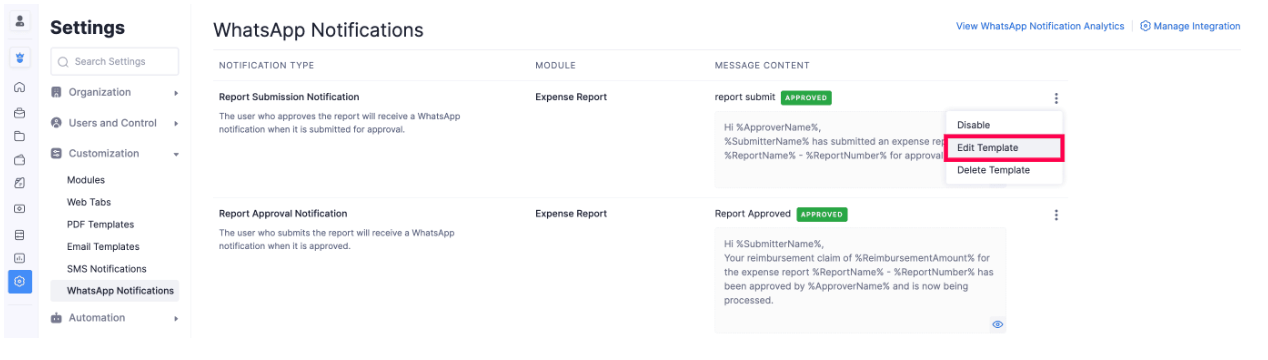 To send notifications through WhatsApp, create a template in Zoho Expense and get it approved by the WhatsApp Business team.