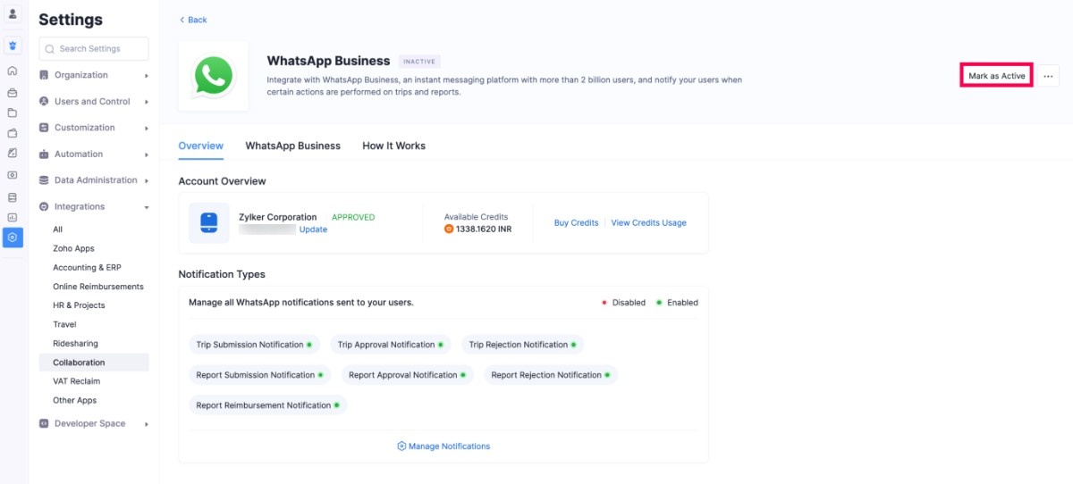 If you want to re-enable WhatsApp Integration for your organisation, you can mark WhatsApp integration as active. Here’s how:
