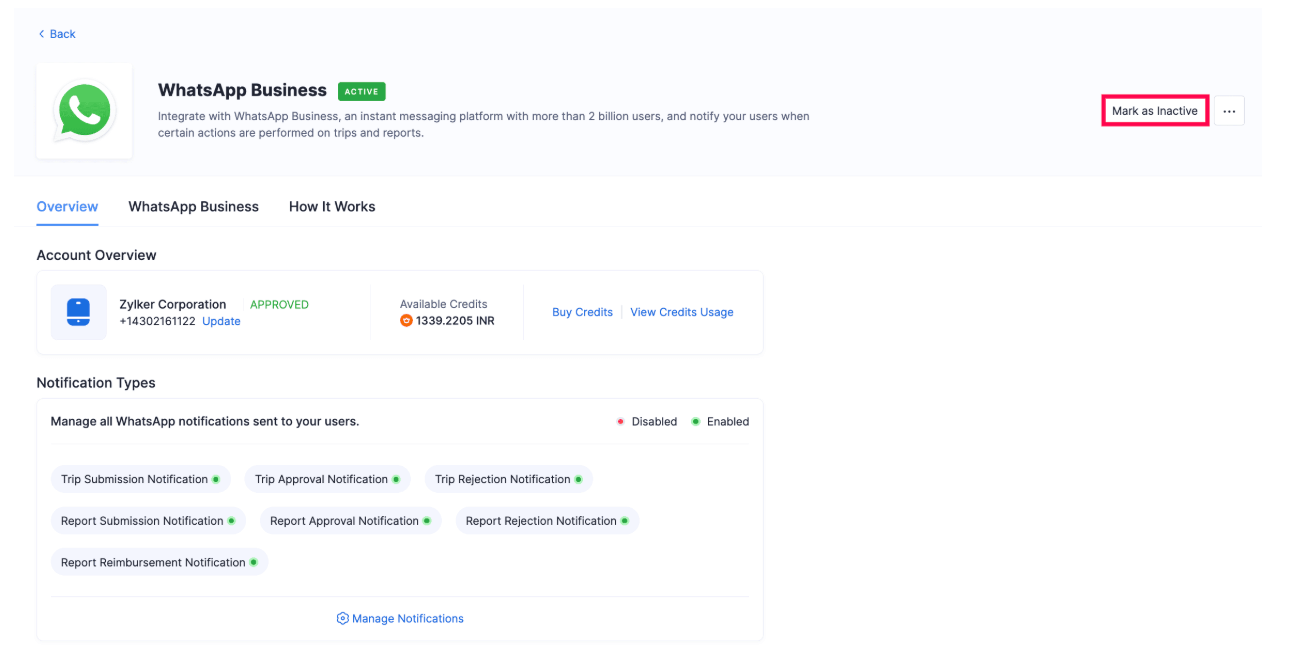 If you want to disable the WhatsApp integration temporarily, you can mark it as inactive. Here’s how: