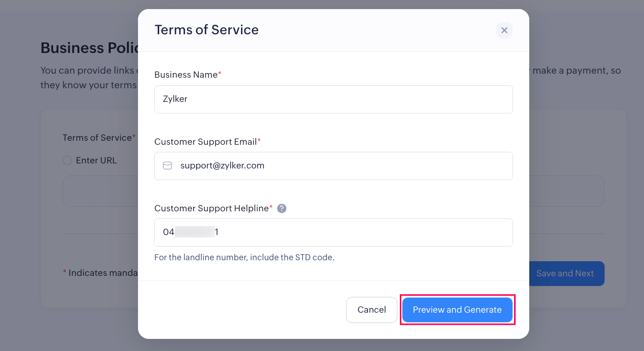 Zoho Payments requires you to provide your Terms of Service and Refund and Cancellation policies to keep customers informed about your business practices. If you don’t have a policy or are unsure about the format, you can generate templates for both policies while setting up your Zoho Payments account.