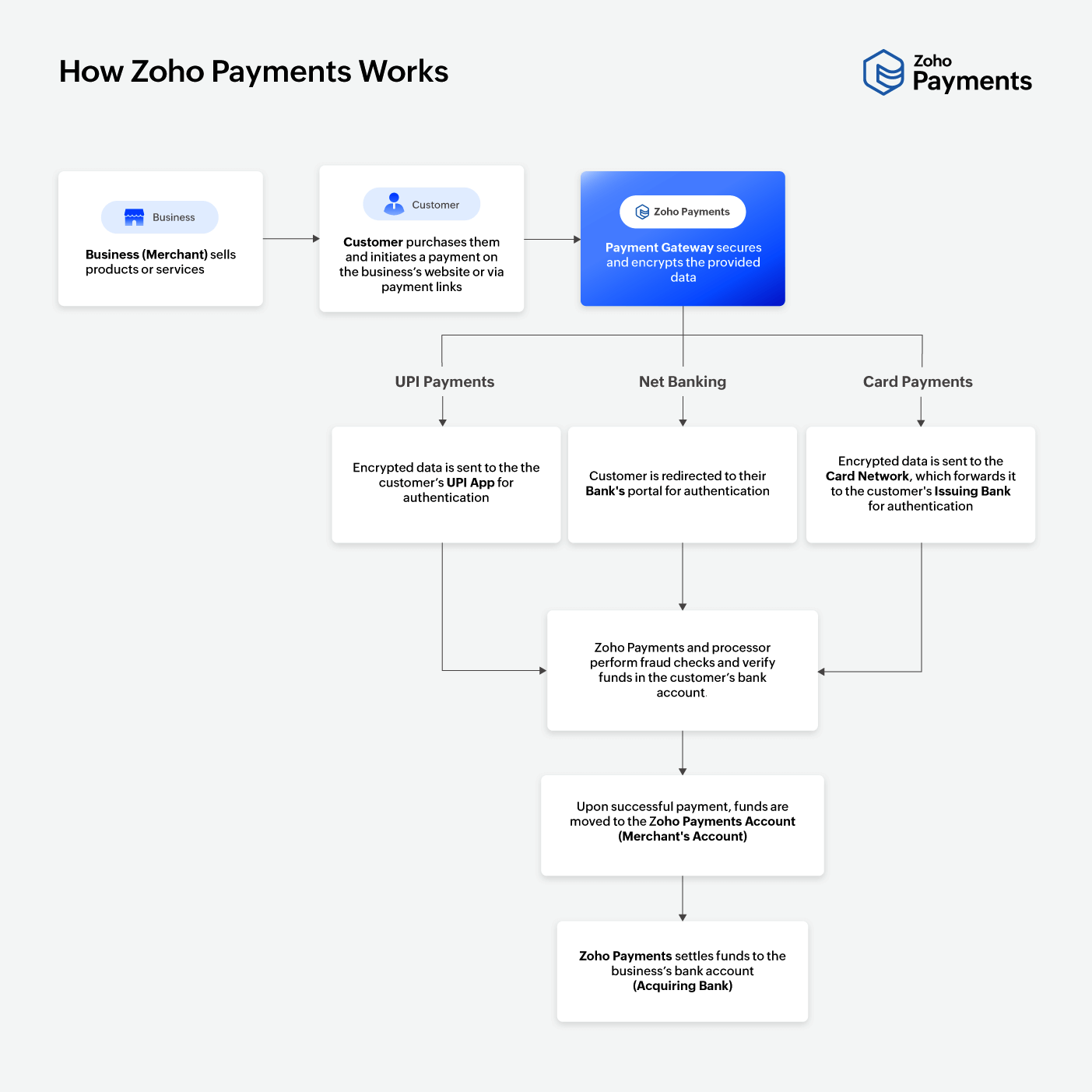 The payment is then moved to your Zoho Payments Account where the payment is held temporarily. Then the amount is settled by Zoho Payments to your business' bank account in batches that you’ve chosen (payouts).
