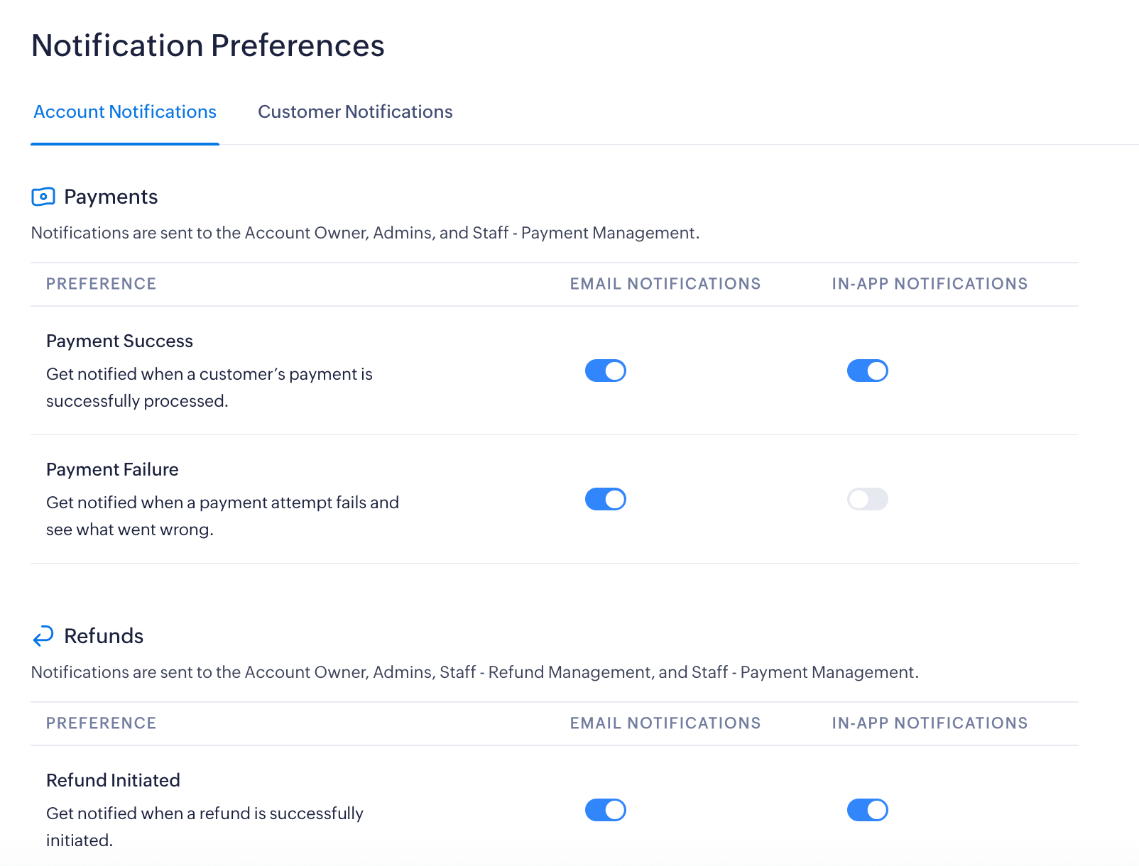 To manage the notifications you receive from Zoho Payments, configure your account notification preferences.