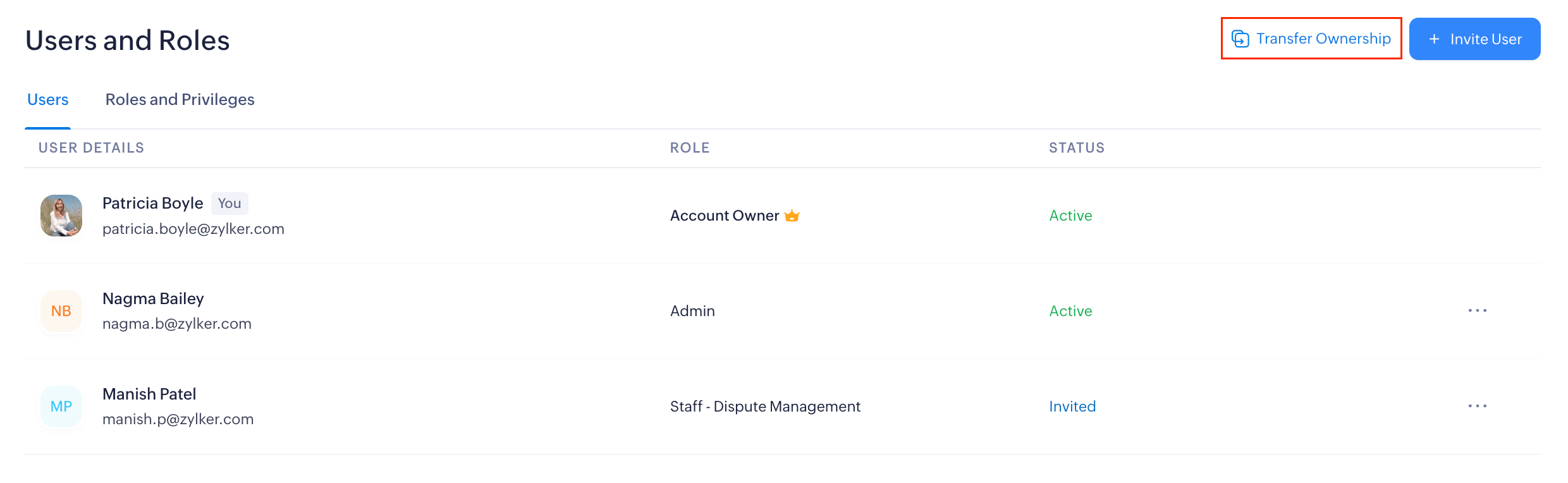Scenario Patricia runs a clothing store and uses Zoho Payments to receive customer payments. As she started to get more orders, there were also multiple returns, cancellations, and damages, and she found it difficult to track them all by herself. To resolve this, she added her staff as users to access her account. Each of these users was also assigned roles accordingly. Now, the active users in the account can help her manage all payments, refunds, and disputes, as required.