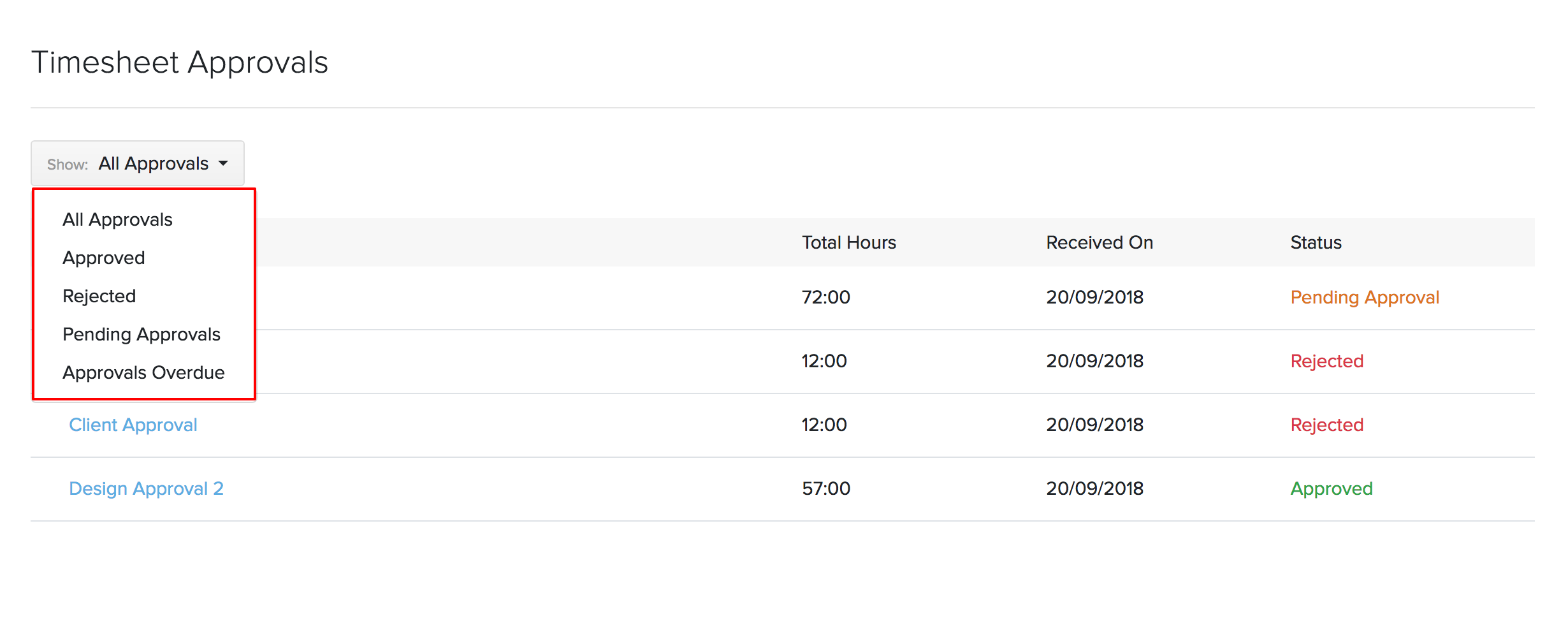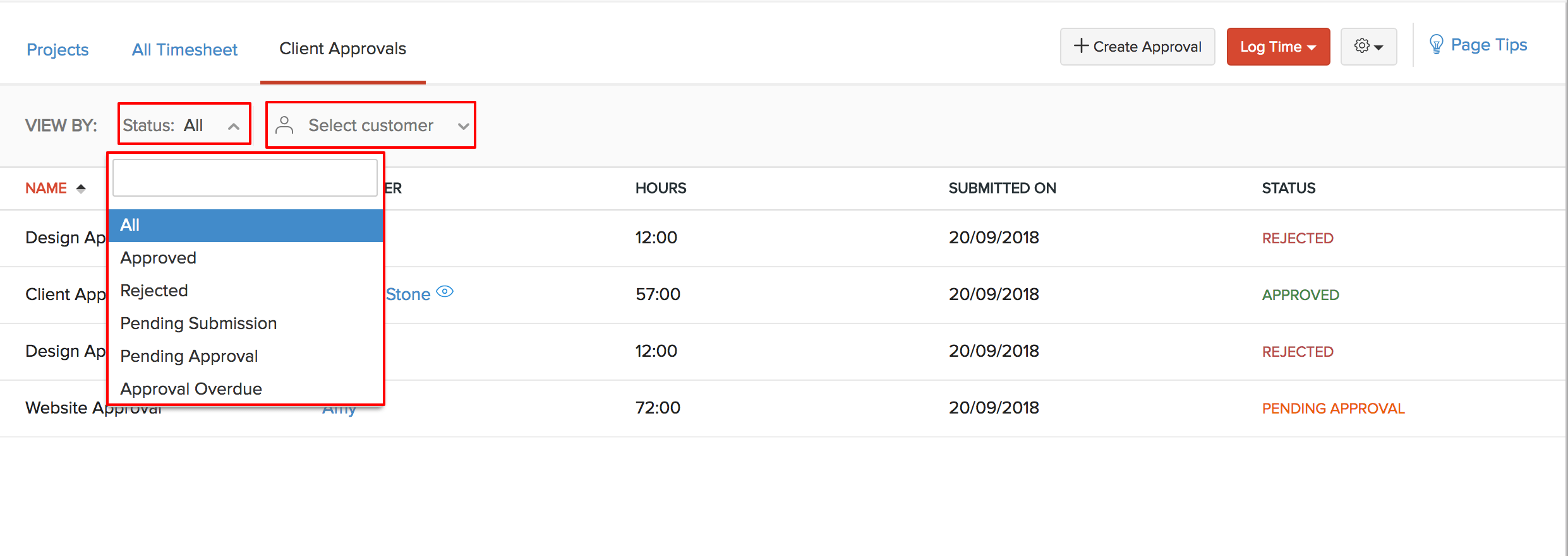 Client Approvals can be listed based on their status and the customer names. The status can be chosen from the Status dropdown and the customer name can be chosen from Select customer dropdown. The following are the filters status that are available in Zoho Invoice for Client Approvals: