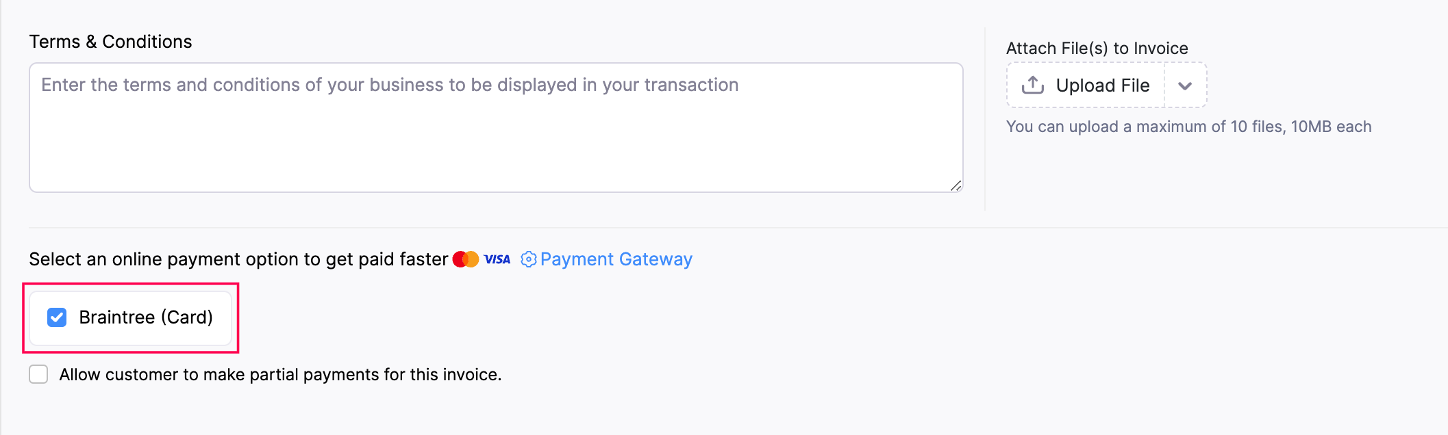 After setting up the integration in Zoho Invoice, enable Braintree as a payment option in invoices to receive payments.