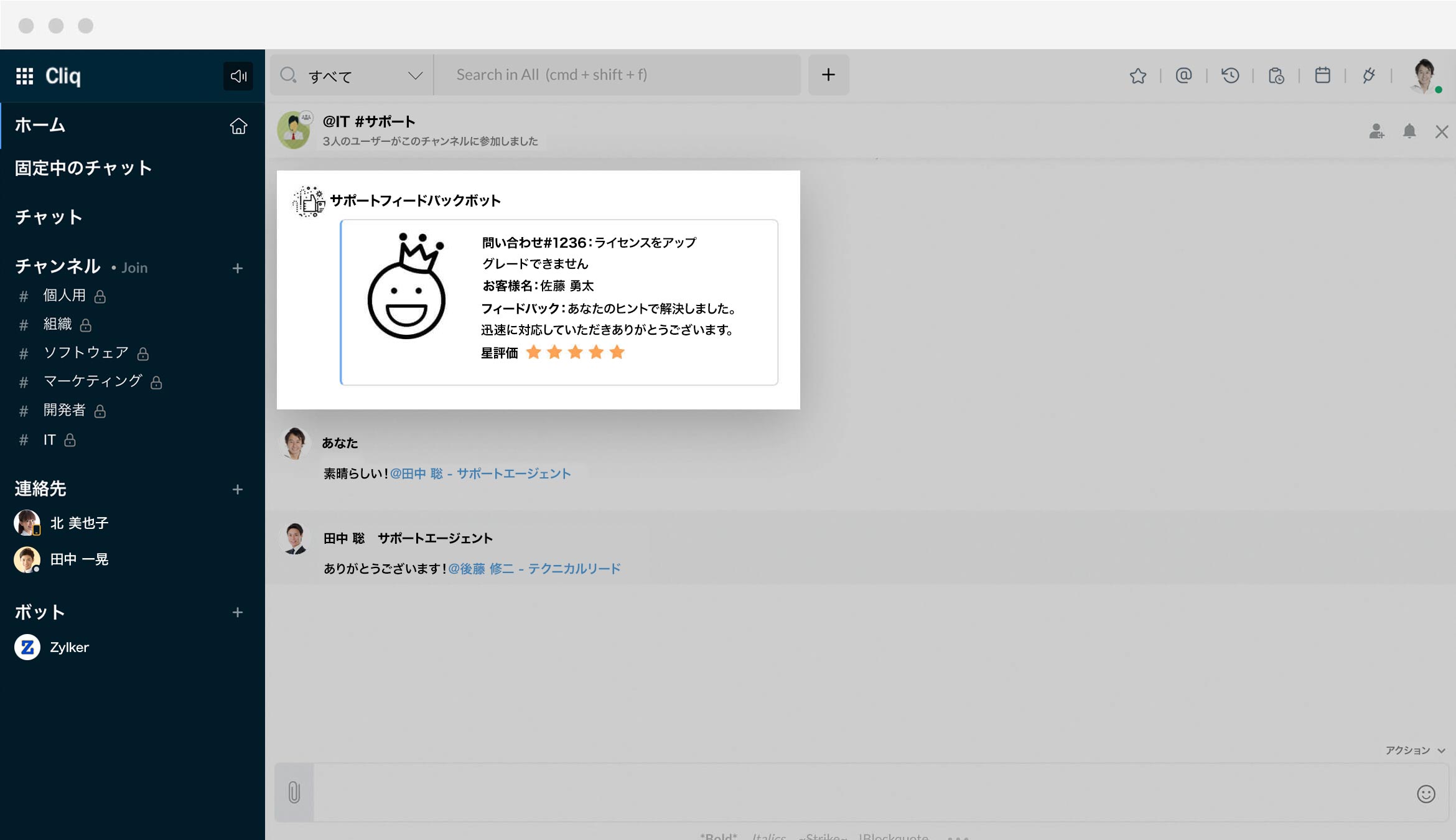 該当する案件の解決プロセスについて顧客からフィードバックを集め、サポートチームのパフォーマンスを評価。ボットを使用して貴重な情報をチームチャンネルに供給し、改善点を明らかにします。
