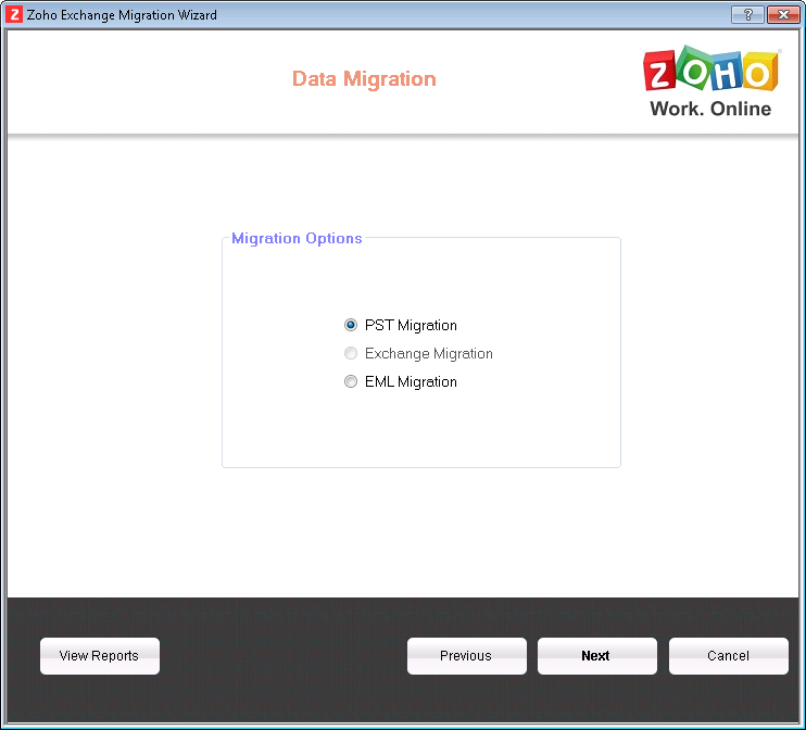 1. Launch the Wizard using the desktop shortcut or execute the file 'ZohoMigrationWizard.exe' from \Zoho\Zoho Exchange Migration\bin folder, under the installation path.