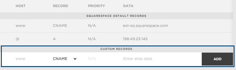 - Scroll down to Custom Records and choose CNAME from the drop-down menu.