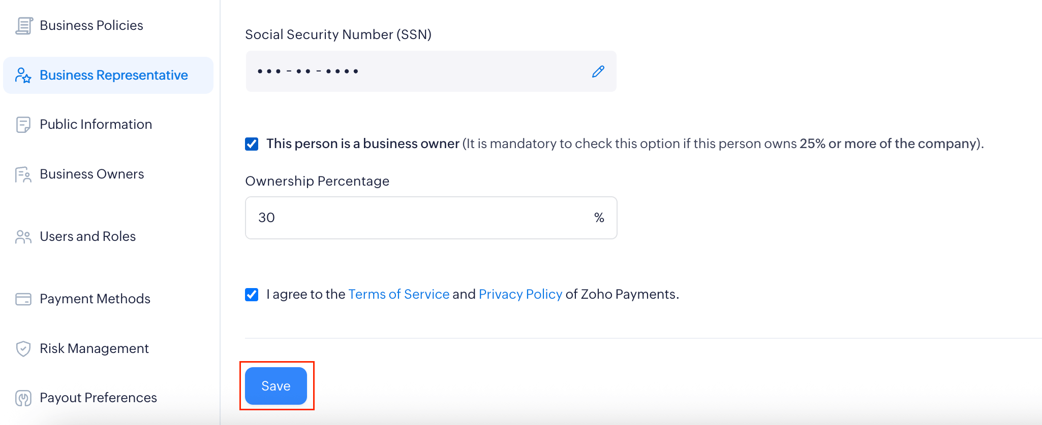 Once verified, Zoho Payments will update the business representative as a business owner. You may need to provide additional details or documents to complete the verification process.