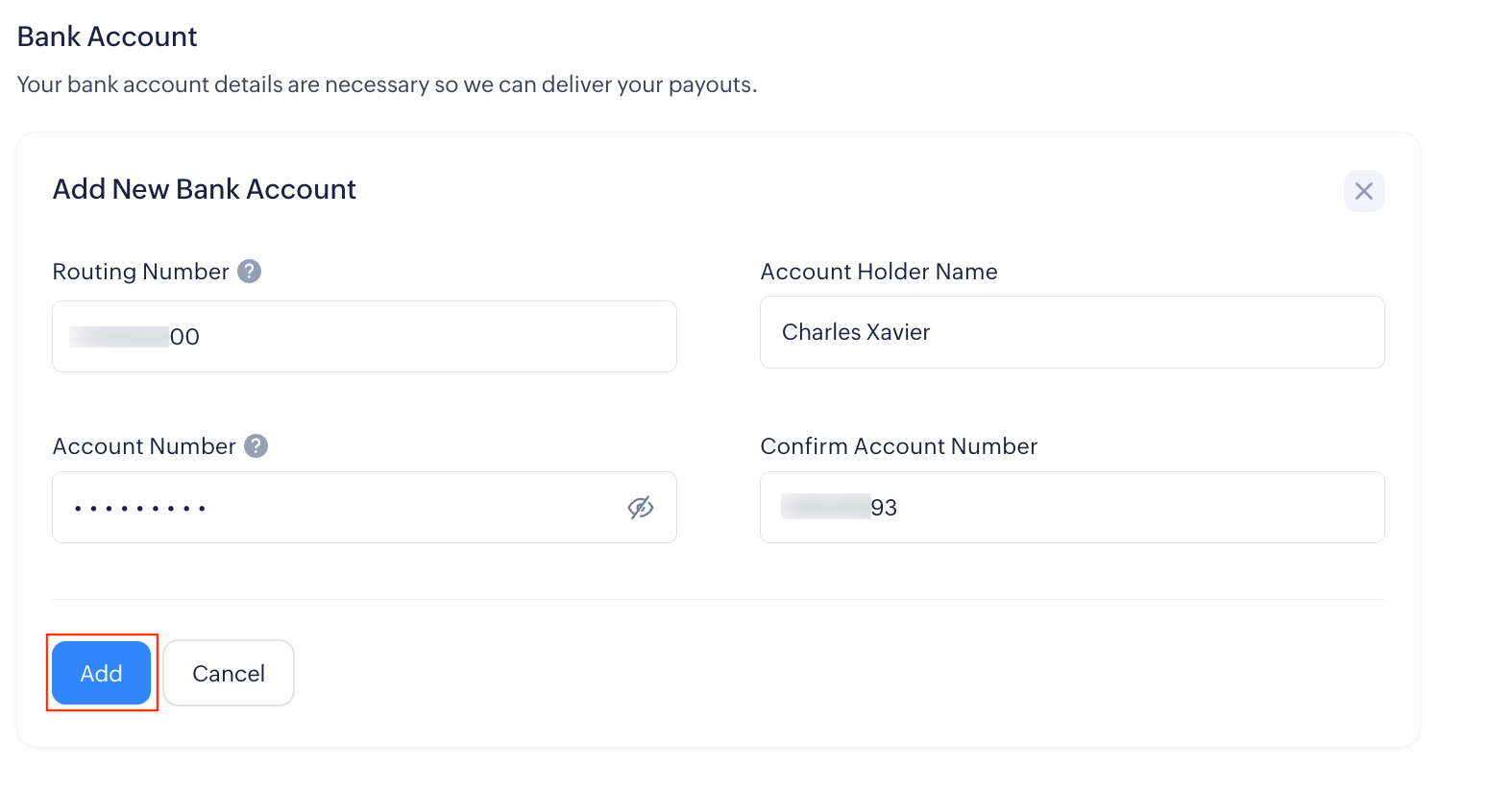 The bank account details will be updated, and future payouts from Zoho Payments will be deposited to the given account after bank account verification. Note that payouts may be temporarily put on hold during the verification process.