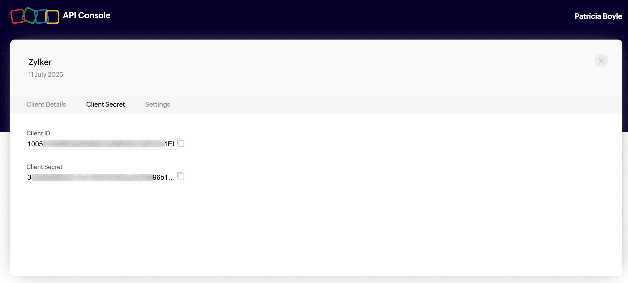 Your Client ID and Client Secret will be generated. You can access them from the Client Secret tab in the Zoho Developer Console.